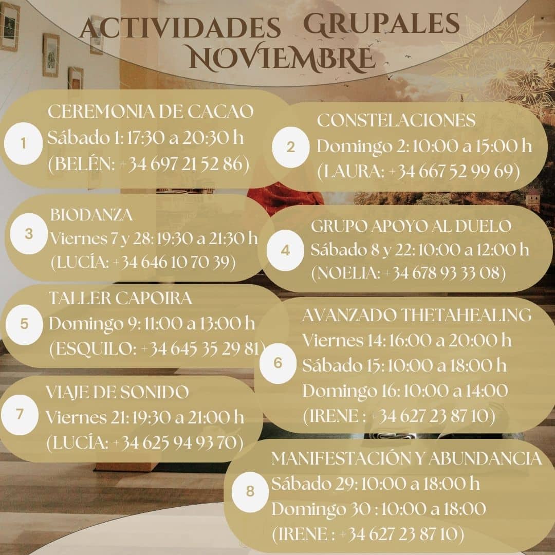 Cada mes, abrimos un círculo de sanación con propuestas como constelaciones familiares, viajes de sonido, ceremonias de cacao y talleres de transformación personal, ThetaHealing. Al tratarse de encuentros mensuales, cada actividad está pensada para que vivas una experiencia única e intensa que te ayude a soltar bloqueos, ampliar tu conciencia y reconectar con la esencia de tu ser.